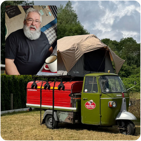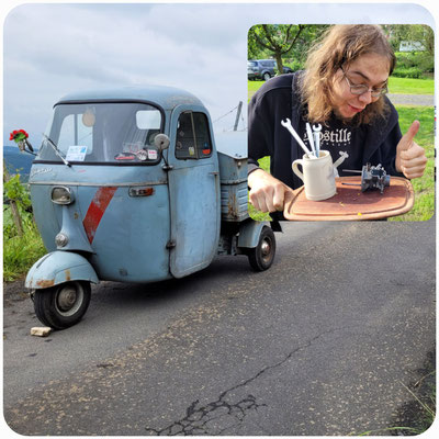 Ape 50, seine TM Diesel hat er seit 2011 und seit 2021 trägt sie sein Reise-Bettchen.